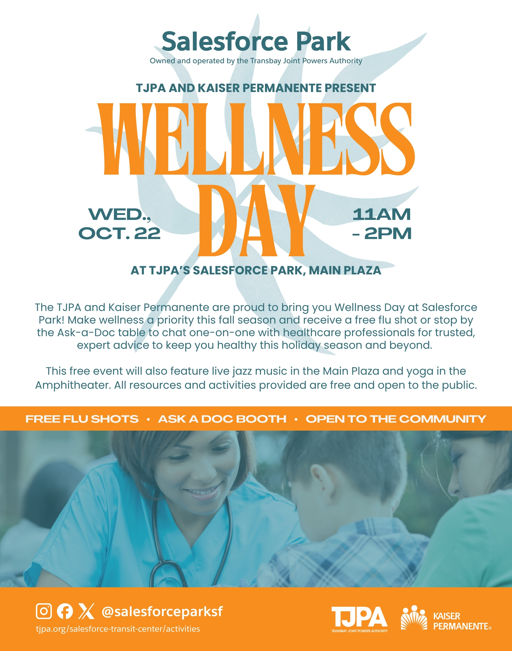 The TJPA and Kaiser Permanente are proud to bring you Wellness Day to Salesforce Park! Make wellness a priority this fall season and receive a free flu shot or stop by the Ask-a-Doc table to chat one-on-one with healthcare professionals for trusted, expert advice to keep you healthy this holiday season and beyond.